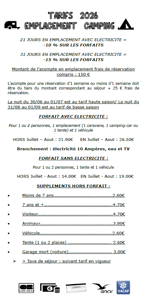 Veuillez trouver ci-joint, les tarifs de nos emplacements nus. Pour un séjour au grand air en pleine nature.